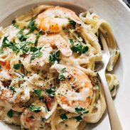 This was so easy to make and absolutely fabulously delicious! Reducing the wine took a lot longer than the recipe suggested, but certainly didn’t hurt the shrimp in this case. I used regular whipping cream, dry sage, pre minced garlic and a mix of pre grated Parmesan, Asiago and Romano cheese. It was what I had already. Love cheese, so I added extra. I’m not a pasta person but this was just yummylischious!