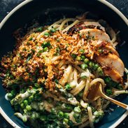This is an easy, fast, and delicious spring dish. The sauce is perfect in terms of taste, creamy texture and amount. (Unlike so many recipes, this one yielded plenty of sauce for the pasta. Chicken broth addition is brilliant). Seems like a very versatile recipe, as well. We left off the bread crumb topping and and added chopped, sautéed snap peas in addition to frozen peas, and it was amazing.